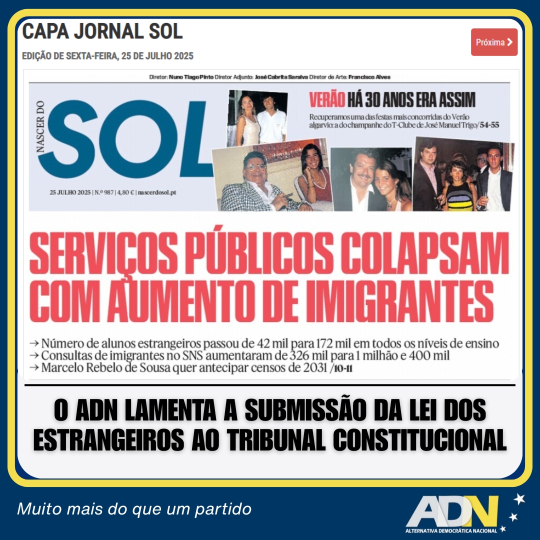 O ADN lamenta a submissão da Lei dos Estrangeiros ao Tribunal ConstitucionalO partido ADN lamenta profundamente a decisão do Presidente da República de submeter ao Tribunal Constitucional a nova Lei dos Estrangeiros, aprovada pela Assembleia da República. Esta decisão atrasa a entrada em vigor de medidas urgentes e necessárias para